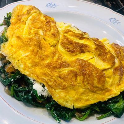 When fully cooked, add your spinach filling and cheese. You can add a tiny bit more water and cover to heat the filling fully. Fold over and out onto your plate!